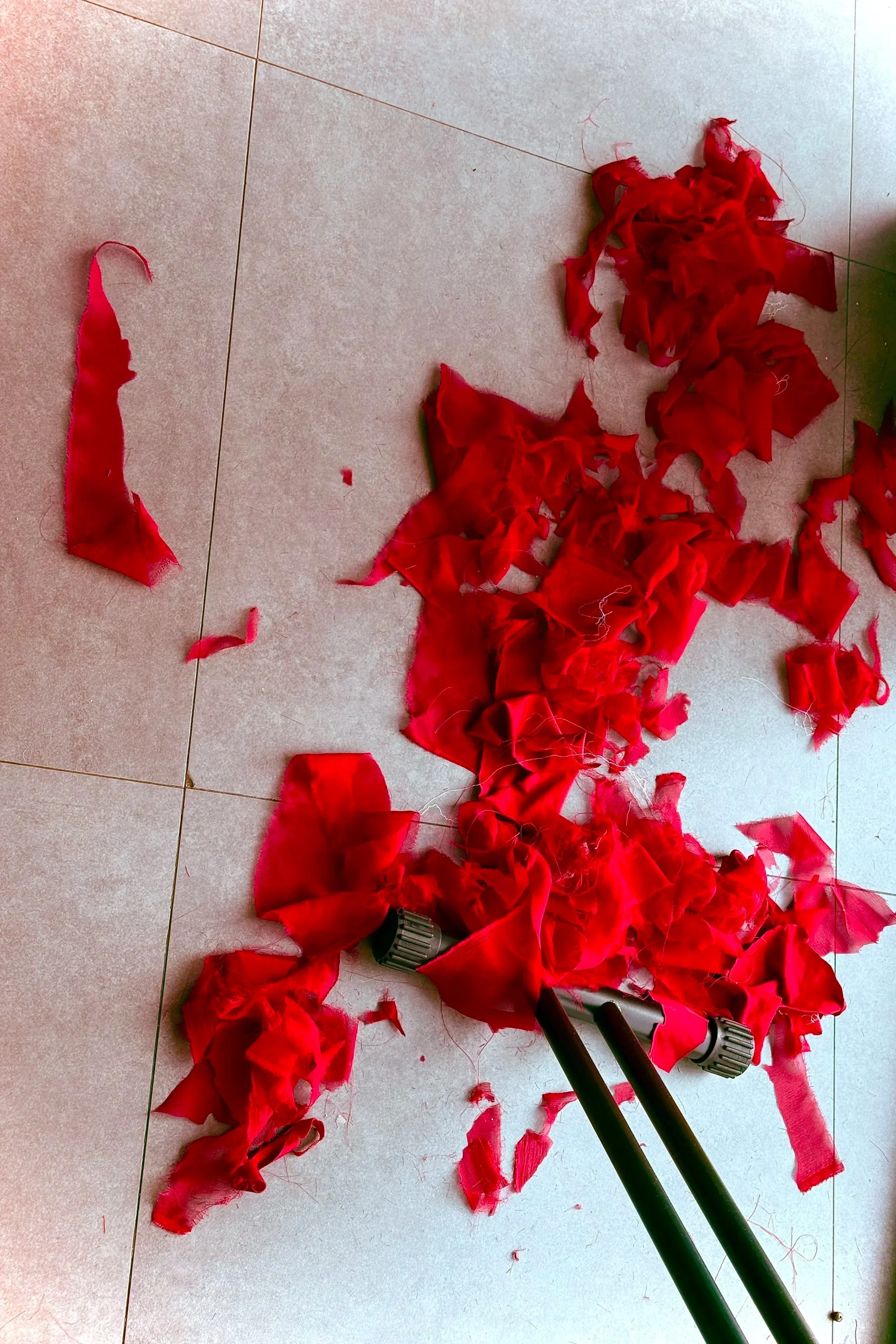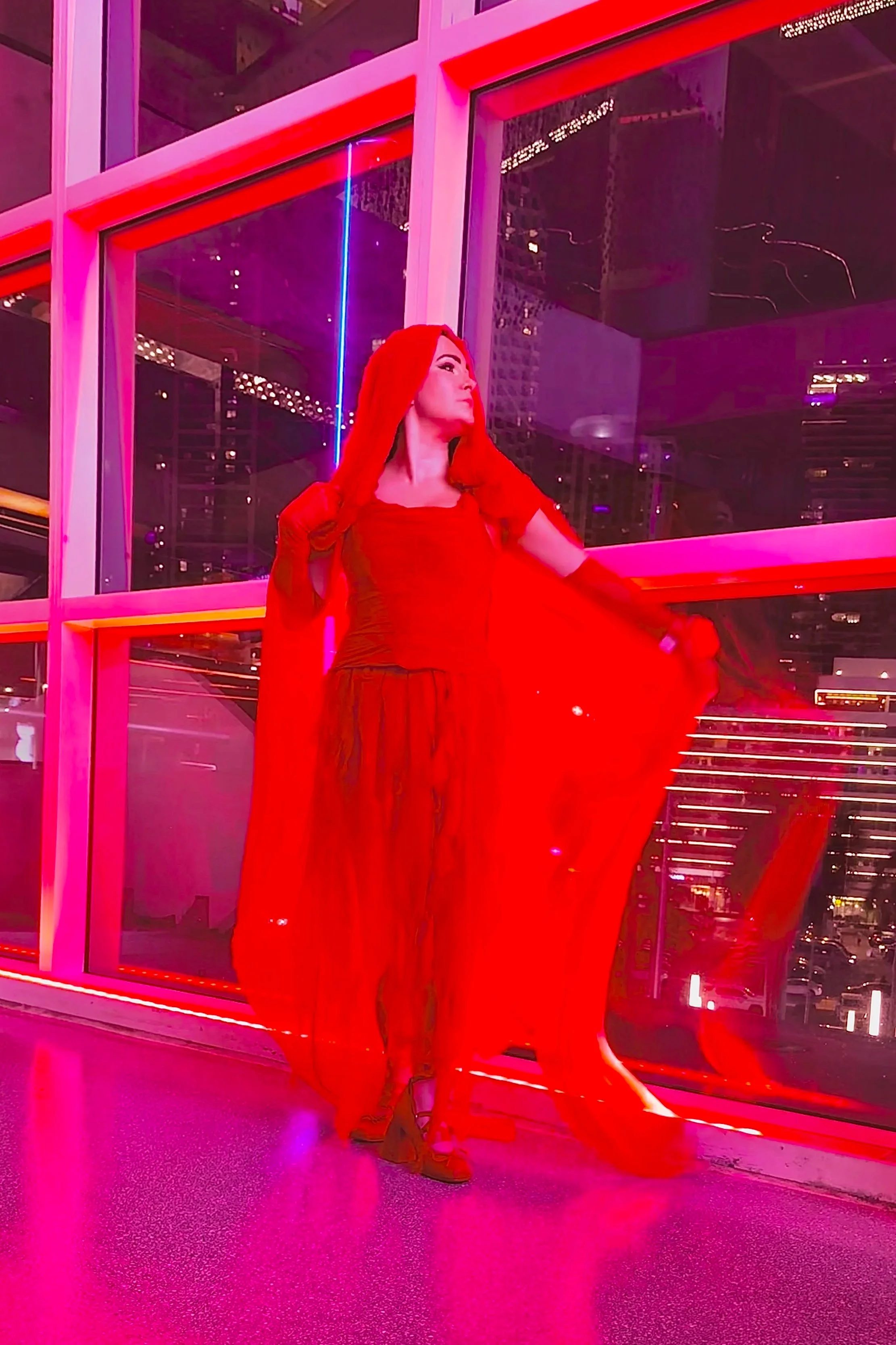 Recreating this iconic look from Lady Gaga’s “ABRACADABRA” music video for a fellow little monster was so much fun. The silk chiffon ensemble consists of a custom drafted corseted top, hand distressed skirt, and matching cloak.